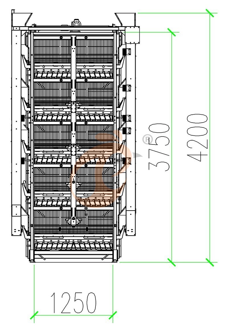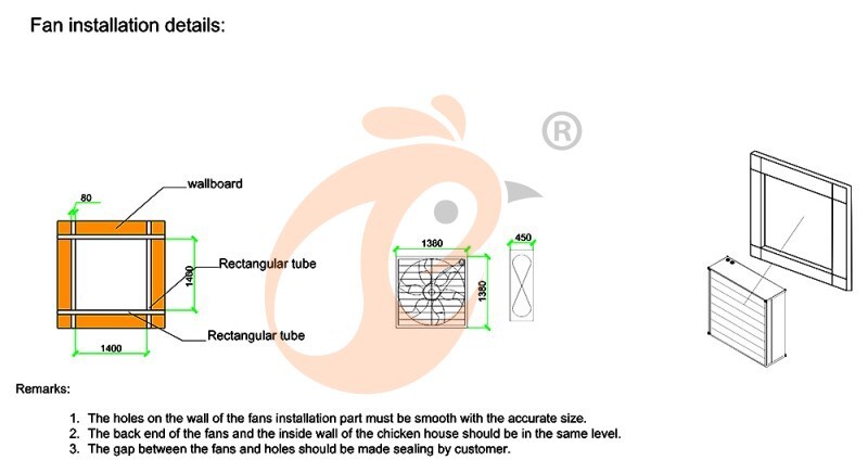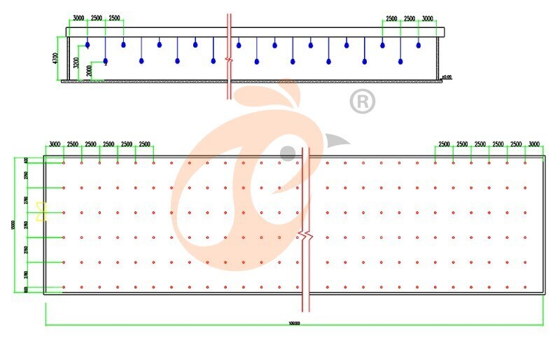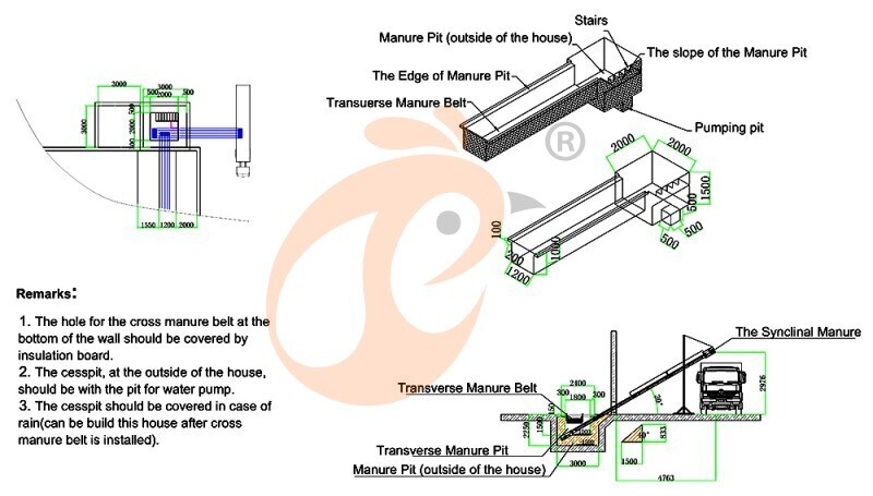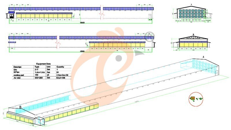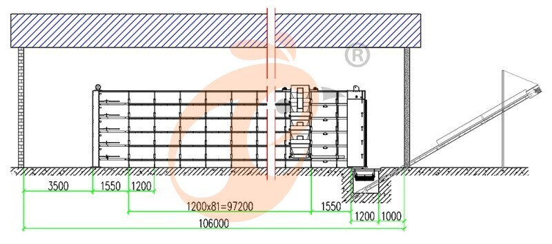 2. Dimensiones del gallinero: 106*15*4.7 metros, 81 juegos/fila*5 filas=405 juegos/gallinero